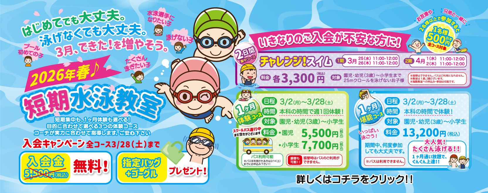お知らせ 2026年春季短期水泳教室について 春季短期水泳教室について read more 筑後キッズ アクアスロンのご案内 筑後キッズ アクアスロンのご案内 read more 2025年夏季短期水泳教室について 夏季短期水泳教室について read more 2025年春季短期水泳教室について 春季短期水泳教室について read more 初めてのスイミング 入会までの流れや手続きに必要なものをご案内いたします。 詳しくはこちら スタッフ紹介 当スイミングスクールで働くスタッフをご紹介します。 詳しくはこちら 施設概要 当スイミングスクールの入口やプール棟の紹介です。 詳しくはこちら WESWIMCLUB はどんなところ? お子様が安心してレッスンが受けられる様1人1人に注意をはらい、危険行動にも、迅速に対応出来る様な体制で指導しています。元気よく楽しく練習が出来る様に、会話を大事にしながら授業を進めます。 詳しくはこちら コースラインナップ 幼児・園児コース(3歳〜6歳)、学童コース(小、中学生)、選手コース(コーチ推薦)、トライアスロンコース(小学生〜成人)の4つに分かれており、お客様にあったコースをお選びできます。 詳しくはこちら ブログ 選手コース 第57回九州ジュニア水泳競技大会結果 2025年10月7日 選手コース 第57回九州ジュニア水泳競技大会結果 read more 選手コース 第48回全九州スイミングクラブ夏季水泳競技大会結果 2025年8月28日 選手コース 全九州スイミングクラブ夏季水泳競技大会結果 read more 2025年度 福岡県水泳連盟 強化指定選手 認定 2025年8月19日 2025年度 福岡県水泳連盟 強化指定選手認定 read more 第48回JOCジュニアオリンピックカップ夏季水泳競技大会 標準突破出場決定 2025年7月18日 第48回全国JOCジュニアオリンピックカップ夏季水泳競技大会 出場決定 read more お問い合わせ お問い合わせ用件(選択してください)見学・体験について入会についてバスについて選手・育成コースについてその他 Δ